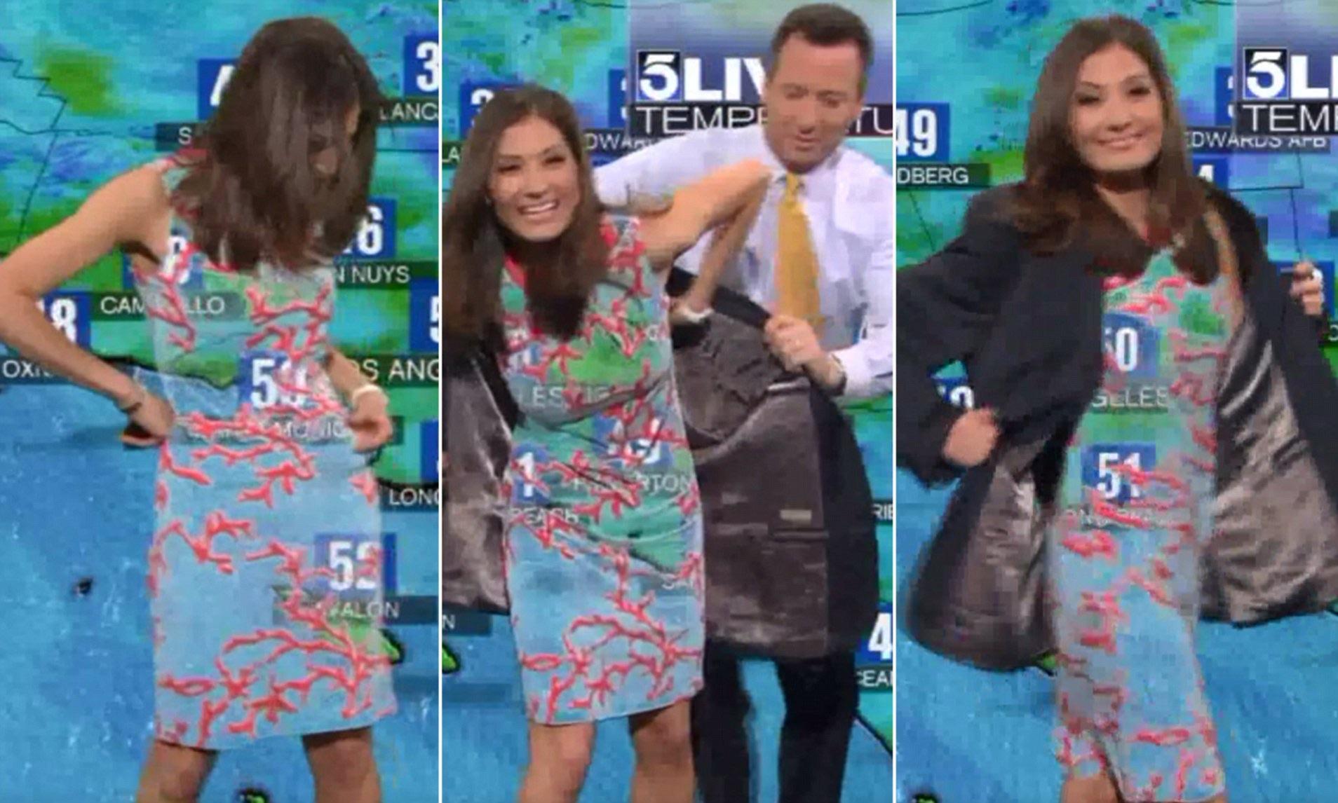 A weather forecast gone wrong became an accidental fashion show when KTLA 5 News meteorologist Liberté Chan wore a white dress with a coral design in front of a green screen. Instead of presenting the weather, the graphics superimposed over her dress turned the whole segment into a bizarre visual. This wasn’t the first time Chan’s wardrobe caused awkwardness on air—another time, she was asked to wear a sweater over a cocktail dress. The resulting mix-up, called #Sweatergate, sparked a wave of reactions from viewers, proving that fashion choices on live TV can lead to unintended controversy.