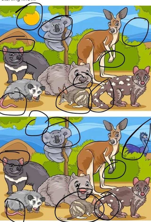 - Emu: No emu in the top scene; a hidden emu appears in the bottom.