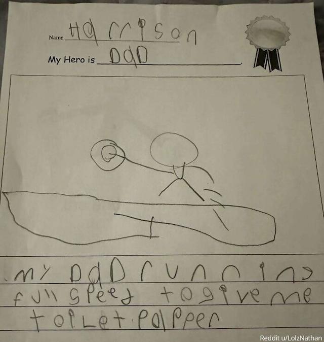 A child’s drawing of their dad as a toilet-paper-carrying hero during a family emergency became a viral sensation, capturing the humor and chaos of family dynamics.
