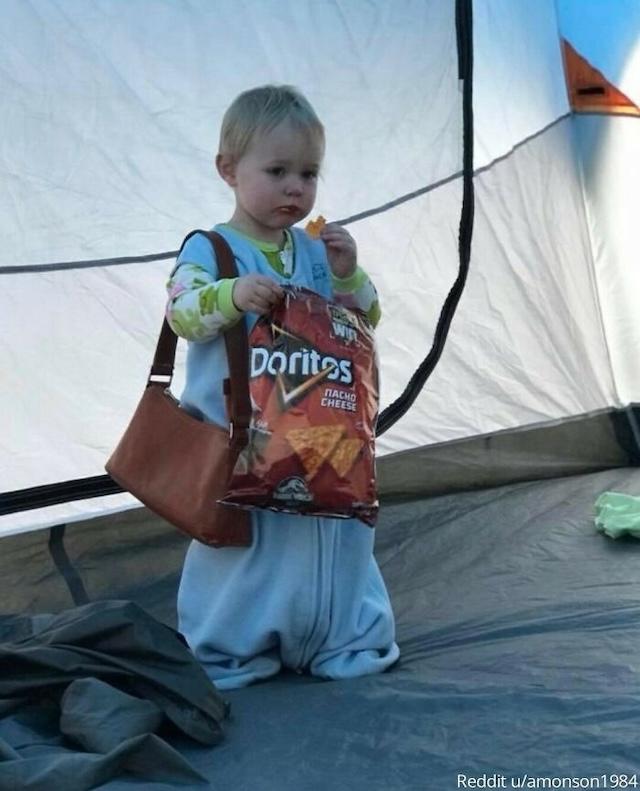 A toddler waking up a parent at 6:15 a.m. with a giant Doritos bag inside their camping tent is as relatable as it gets for family camping trips. These moments showcase the joys and trials of parenthood.