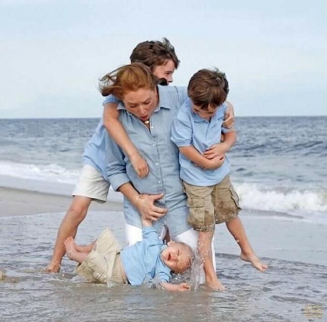 A perfectly planned beach photo shoot turned chaotic when one son jumped onto his mom’s back, sending his infant brother flying into the water. Thankfully, everyone laughed about it later.