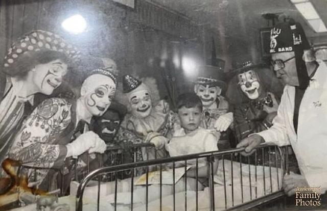A child in a hospital bed surrounded by clowns and a man in a fez created a surreal yet touching photo. It reflects the kindness of strangers who try to bring joy to difficult situations.