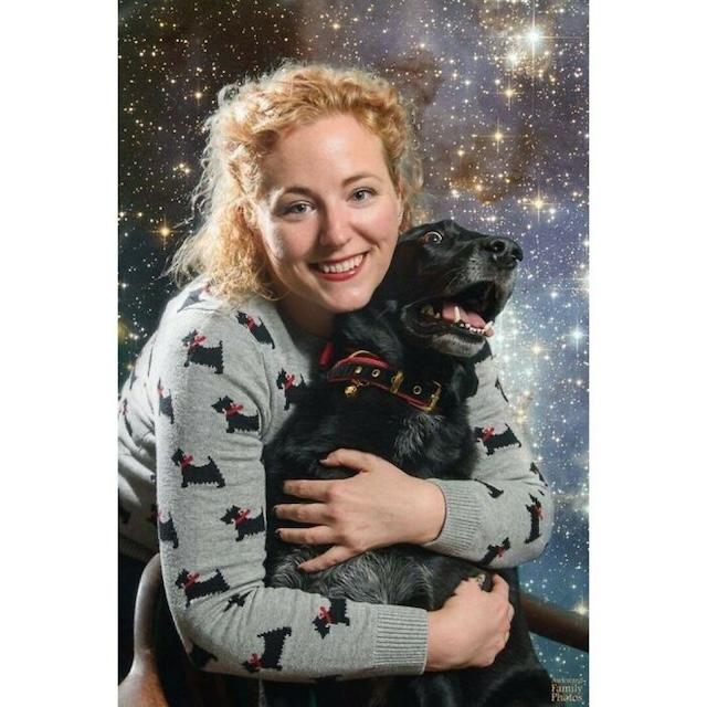 A family attempted a quirky space-themed portrait, but their uncooperative dog stole the show. This photo reminds us that pets are always the wild cards of family life.