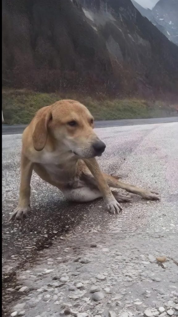 He lay just beyond the edge of traffic, where cars rushed past without slowing, where people rarely looked twice. His body was stretched out against the cold ground, thin and unmoving, as if he had learned that conserving energy was the only way to survive. His fur was knotted and unclean. His breathing was shallow. And his eyes — half open — followed the motion of a world that did not stop for him.