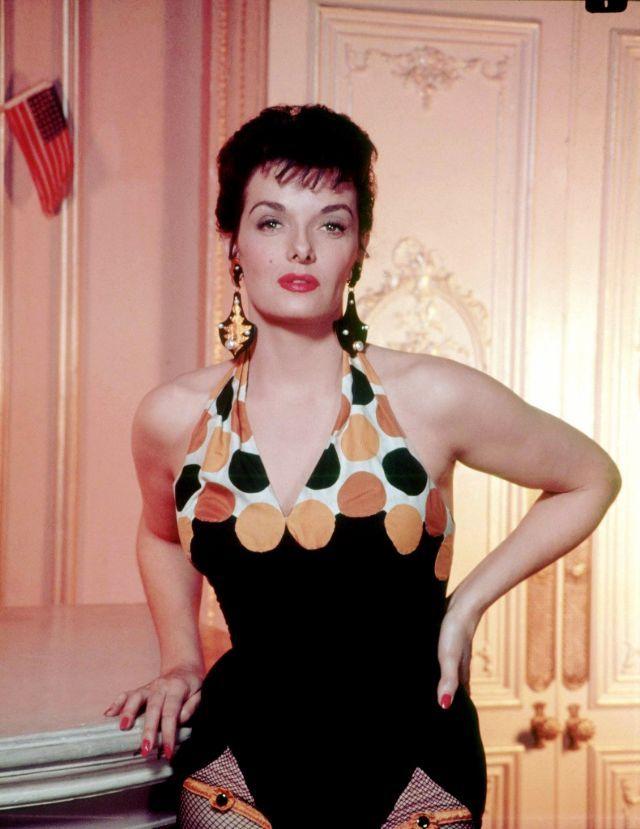 Jane Russell’s style was the epitome of classic Hollywood glamour. She exuded confidence in every outfit, from elegant gowns to tailored suits, always enhancing her statuesque figure. Her signature red lips, bold eyebrows, and voluminous curls made her a fashion icon of her time. Unlike many of her contemporaries, she embraced a more sophisticated, powerful look, setting her apart from the overtly delicate or girlish images promoted in Hollywood.