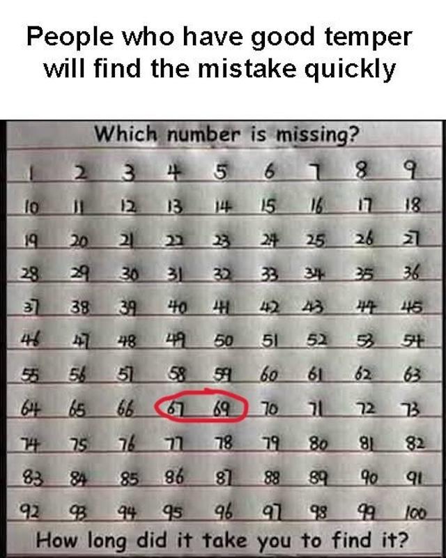 - Spot the Missing Number: Right after 67 should be 68, yet 68 is nowhere to be found.