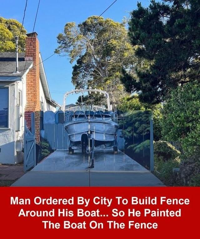 Rather than leaving his fence as a simple wooden barrier, Etienne transformed it into a masterpiece. He painted a mural depicting his boat on the very structure meant to hide it. The result? A fence that didn’t just comply with the rules—it made a statement.