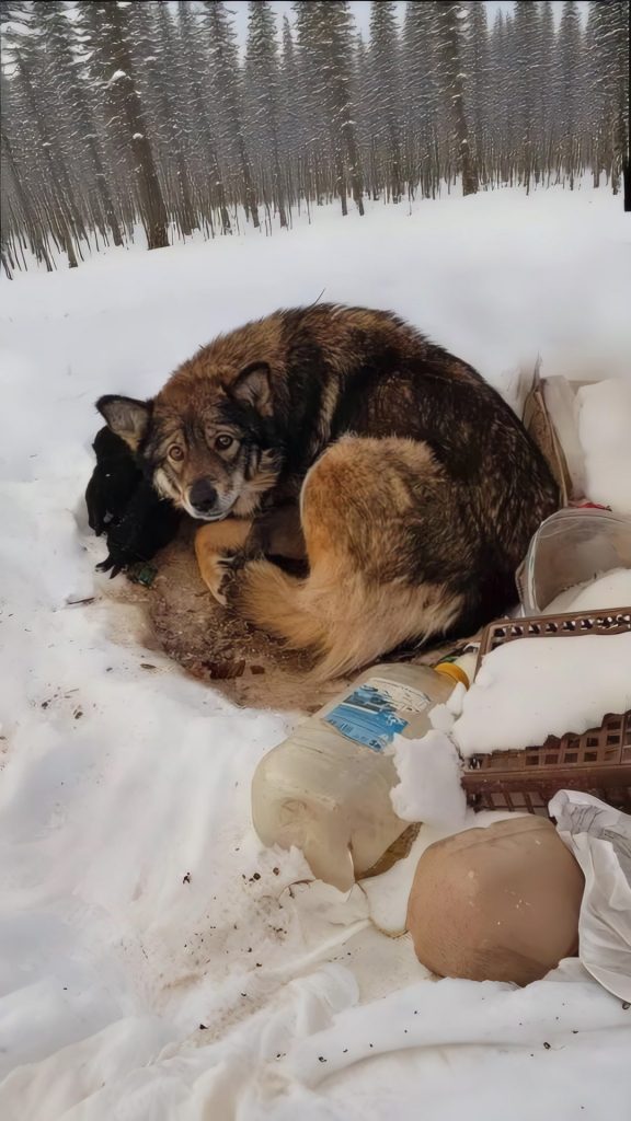 In a shallow hollow carved into the snow lay a dog—exhausted, shaking, barely holding herself upright. Ice clung to her fur. Her breathing was shallow, labored. She had given birth right there, exposed to the open winter air.