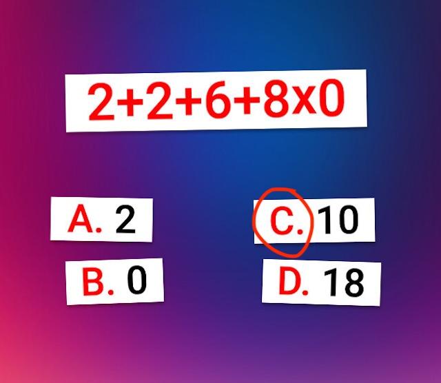 The puzzle: 2 + 2 + 6 + 8 × 0 = ?