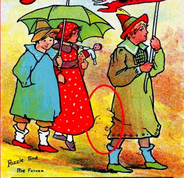 The hidden face is woven into the background—the gap between the girl in the red dress and the blond boy holds the key. Failing to examine this negative space is a common oversight.
