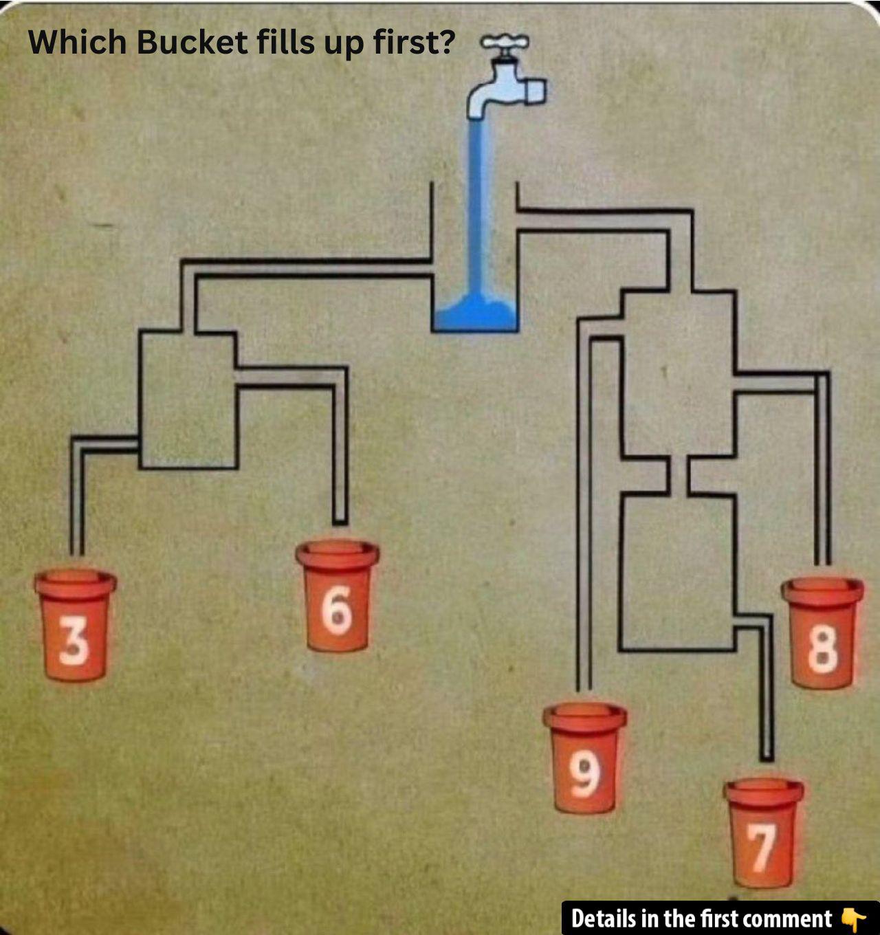 Ever wondered which bucket fills up first in a seemingly tricky puzzle? The image shows a system of interconnected pipes with a faucet spilling water into them. Your task is to identify which of the buckets will be filled first. While the pipes may look confusing, careful attention to detail will reveal the correct answer. Take a moment, look carefully, and put your skills to the test. Can you solve this visual challenge?