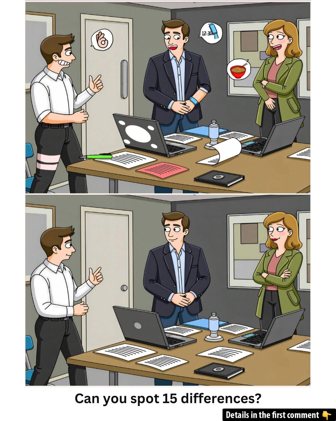 Here’s a classic “spot the difference” challenge set in a busy office scene. At first glance, three colleagues exchange ideas around a desk strewn with laptops, papers, and pens. But look closer—there are 15 subtle changes between the top and bottom images. Can you catch them all before reading on? Take your time, scan every corner, and see how many variations you can find!