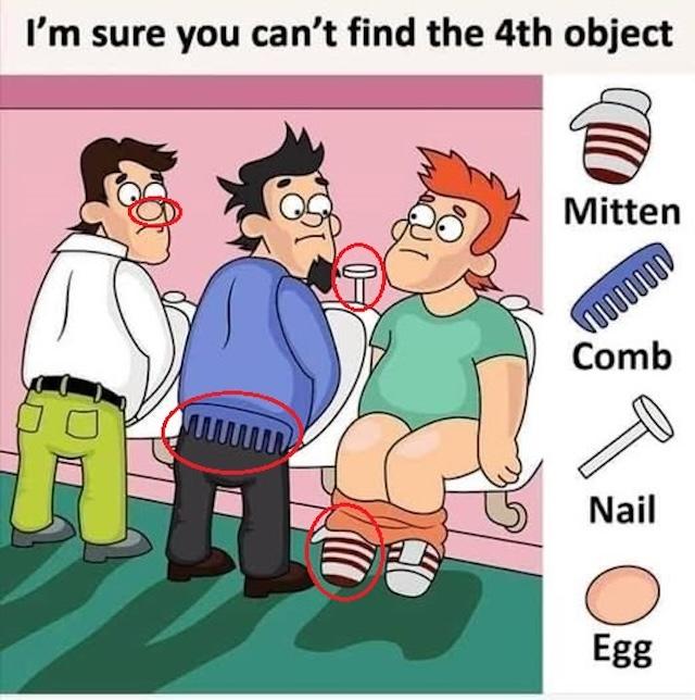 Test your attention to detail with this cheeky restroom scene: three men at the urinals conceal four everyday objects in plain sight—a comb, a nail, a mitten, and an egg. Most solvers glance right past these tiny oddities, mistaking them for wrinkles, levers, or socks. In our step‑by‑step guide, we’ll show you how to methodically scan top‑to‑bottom, left‑to‑right, spot color and shape anomalies, and zero in on each cleverly hidden item. Ready to prove your observational prowess? Dive in, find all four objects, and share your count and detective strategy in the comments!