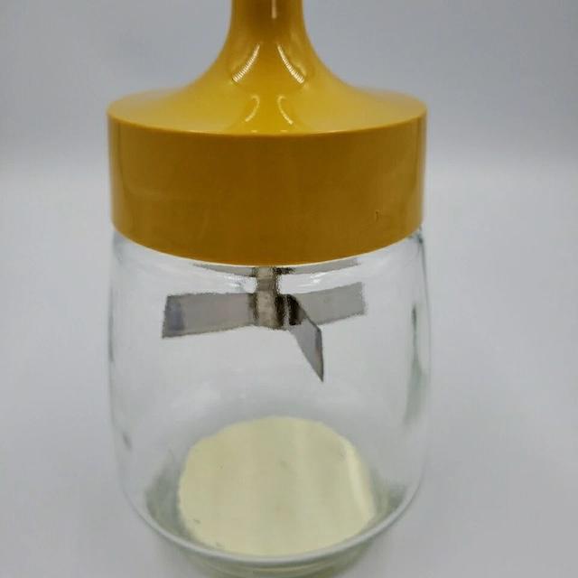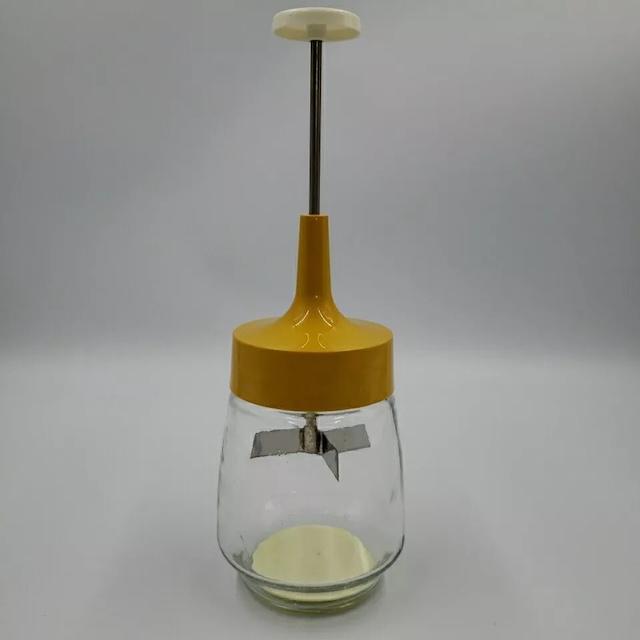The design featured a cylindrical glass jar with a metal blade inside, which was powered by a manual crank on the lid. As the user turned the handle, the blade inside would spin, finely chopping the contents inside. The Vintage Federal Housewares Harvest Gold Manual Food Nut Chopper was especially appreciated for its ability to chop nuts quickly and evenly, without the mess or hassle of using a knife or electric appliance.