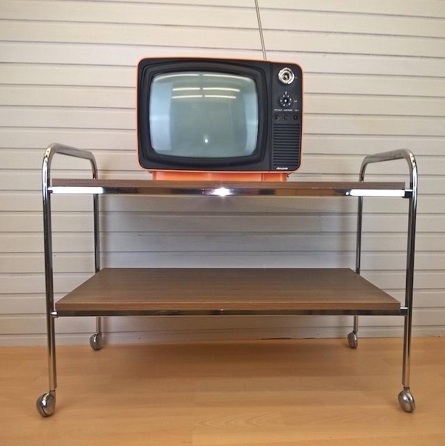 The vintage 1970’s gusdorf tv television stand w wheels was all about functionality meeting style. Crafted with sturdy metal frames and finished with faux wood shelves, it could hold the hefty box TVs that ruled the era. The rolling wheels, a revolutionary feature back then, allowed families to move their precious televisions from room to room without the risk of injury or damage. Plus, the dual shelves gave extra space for storing VCRs, VHS tapes, or even board games.