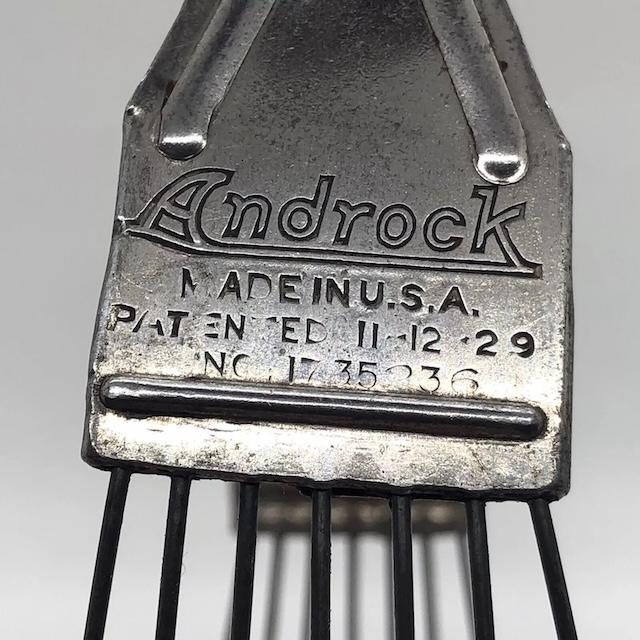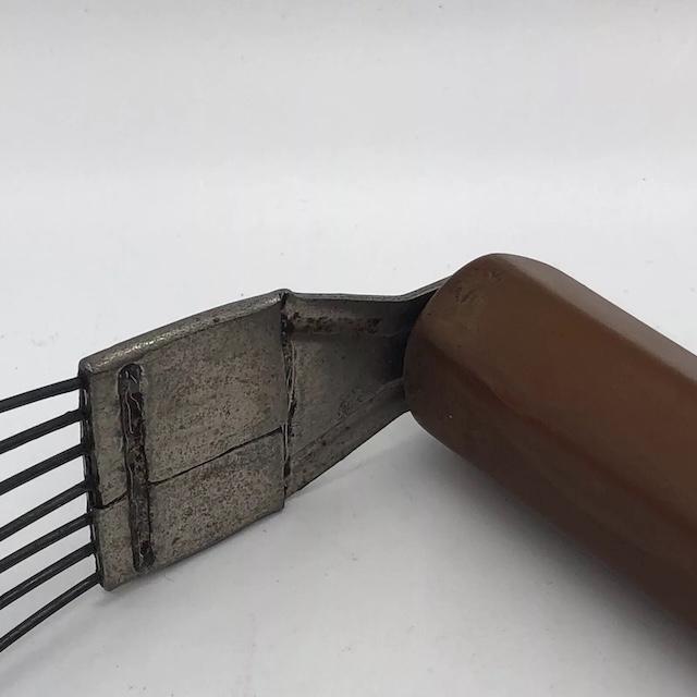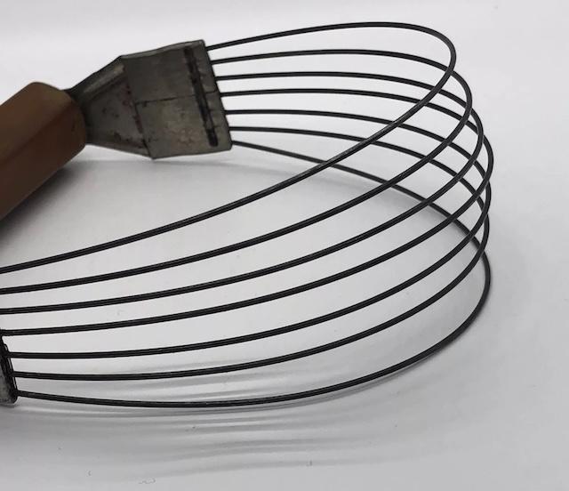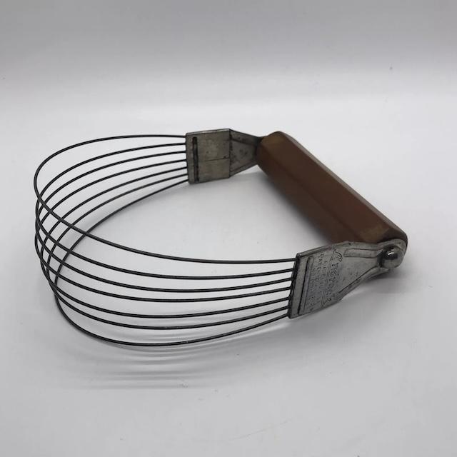 The vintage pastry blender is a kitchen tool designed to cut fat (usually butter or shortening) into dry ingredients, typically flour, when making pastry dough. The device consists of a handle (often made of wood or metal) and several wire blades that are curved and arranged in a row. The user holds the handle and uses a rocking motion to press the blades through the fat and flour, breaking the fat into small pieces that get evenly distributed throughout the dough.
