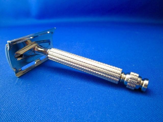 To use the razor, the user would twist the handle to remove the head, insert a new razor blade, and reassemble the device. The blade would be held securely between the razor head and the protective guard, allowing for a close shave without the risk of accidental cuts.