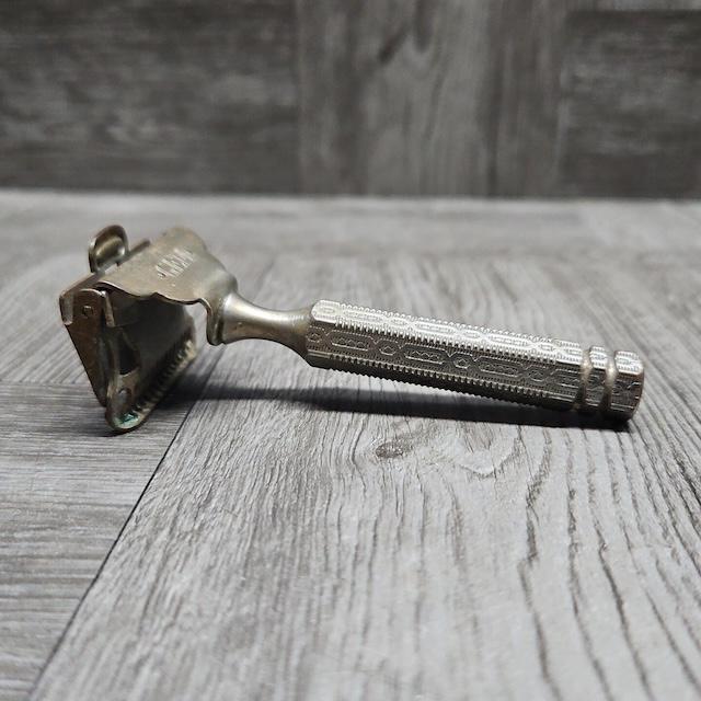 The vintage safety razor was equipped with a protective guard, which shielded the user from the sharp edge of the blade while allowing for a close shave. The design included a handle, often made from metal or Bakelite, with a head that held a single, replaceable razor blade. The convenience of using a replaceable blade without needing to hone or strop the edge like a straight razor made it an instant hit.