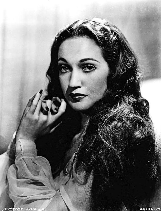 Her hair wasn’t just a cosmetic feature but an extension of her exotic, glamorous roles. In The Hurricane (1937), where Lamour donned a sarong, her hair added to the mystery and allure of her character. The lush, flowing locks framed her face in a way that enhanced her soft-spoken demeanor, while the depth of color and shine created a vivid contrast in both black-and-white and Technicolor films. This visual aesthetic gave her an air of mystery and sensuality that captivated audiences, making her one of the most glamorous stars of the era.