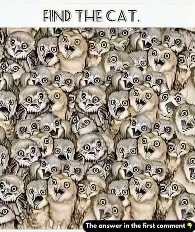 Many people assume that all the creatures in the picture are owls, leading them to overlook the subtle differences that would reveal the cat. The cat’s face is cleverly integrated into the pattern, making it tricky to spot. Pay attention to the positioning of the eyes and the shape of the face to identify the hidden cat. It’s easy to get distracted by the large number of owls around, but it’s the small details that will lead you to the right answer.