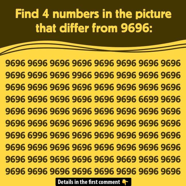 Think you’ve got laser-sharp focus? Our latest brain-teaser challenges you to find four sequences that aren’t “9696” hidden among a sea of identical numbers. Racing against the clock, you’ll need to read each quartet of digits with pinpoint accuracy to spot swapped or flipped characters. In this post, we’ll guide you through common scanning mistakes, a step-by-step detection strategy, and reveal the exact row positions of the four impostors. Ready to prove you’re the most observant? Dive in, look closely, and share your answer and thought process in the comments below!