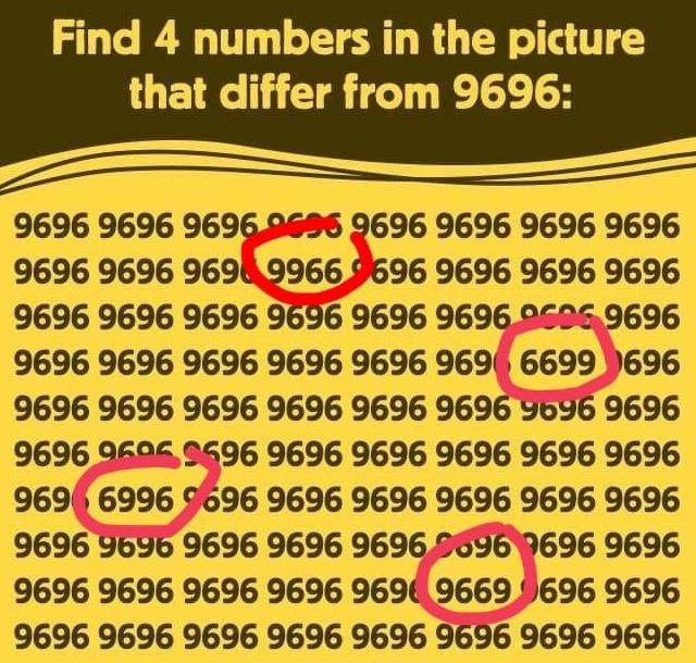 On the surface, every group of digits reads 9696, but four of them break the pattern. Will you notice the swaps, flips, or transpositions before time runs out? Challenge yourself, set a mental timer for about 7 seconds, and scan the grid carefully—only the most observant will succeed!