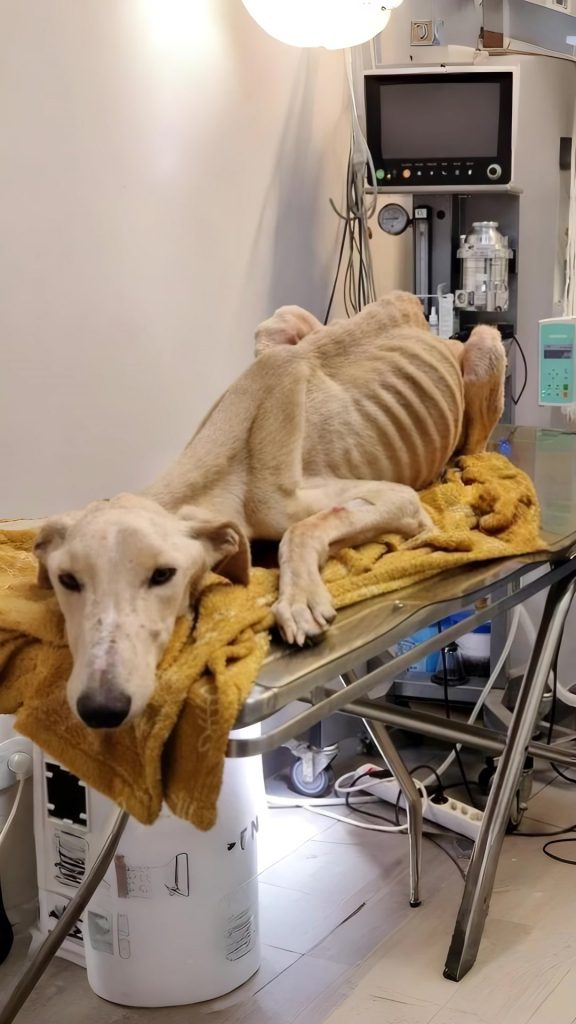 Inside was a dog barely clinging to life. His body was impossibly thin, every bone visible beneath stretched skin. He stood there weakly, eyes sunken but alert, as if unsure whether this moment was real. Later, they would learn his name was Valentine — a gentle greyhound-type dog whose appearance told a devastating story of abandonment and starvation.