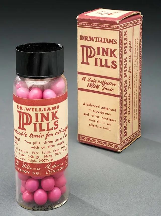Another notorious product was Dr. Williams’ “Pink Pills for Pale People,” a patent medicine that promised to cure a variety of ailments, from nervous headaches to sciatica. Containing a combination of iron sulfate and magnesium sulfate, the pills were marketed as a remedy for fatigue, pale complexions, and even paralysis. Despite their widespread use across the British Empire and beyond, the pills were found to be poorly prepared, with one-third of the iron sulfate oxidized. Though they became famous for their supposed health benefits, they ultimately failed to live up to their claims and were discontinued in the 1970s.