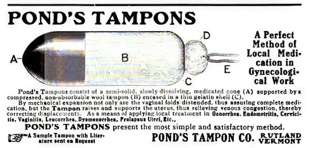 In the late 19th and early 20th centuries, Pond’s introduced a product that would raise eyebrows today: opium-soaked tampons. Marketed as a remedy for menstrual cramps and other female complaints, these tampons were filled with opium, a potent and addictive substance. Opium was commonly used in medicines of the era for its pain-relieving properties, despite its harmful effects. The tampon was part of a larger trend of “medicated” products that made exaggerated claims without any scientific evidence to support their effectiveness.