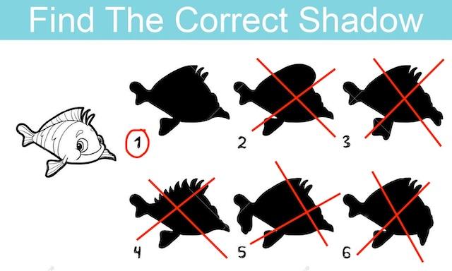 After eliminating the other options, the correct shadow is shadow number 1, which mirrors the fish’s shape accurately.