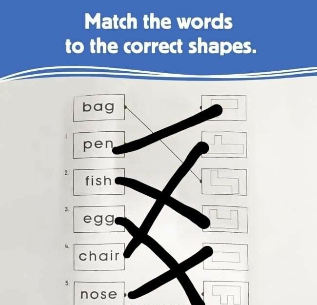 Here’s a deceptively simple puzzle that has tripped up countless players: you’re given six words—bag, pen, fish, egg, chair, nose—and six abstract outlines, and your goal is to draw lines matching each word to its correct shape. It sounds easy, but subtle details in each contour can fool even eagle-eyed solvers. Ready to test your visual logic? Scroll down to see the step-by-step matching key and learn exactly why “bag” belongs to shape 3, “pen” to shape 1, and so on. See if you nailed it before revealing the full solution!