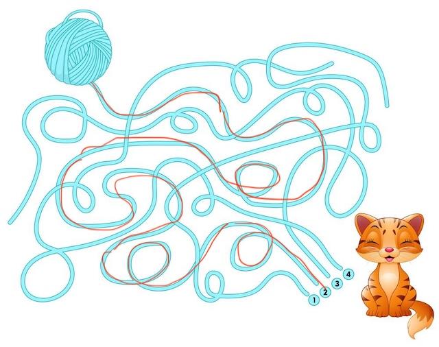 Mazes and tangles are a classic brain-teaser for a reason: they force us to slow down, resist hasty guesses, and pay attention to every twist. In this puzzle, a ball of yarn unfurls into four seemingly similar strands, each winding through loops and curves before it either dead-ends or finds its way to a curious kitten.