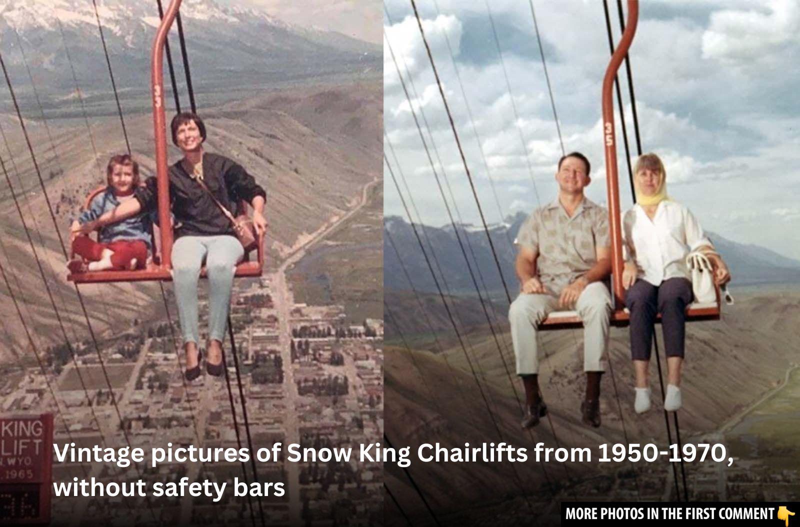 In the 1950s and 1960s, the chairlifts of Snow King looked much different than the modern lifts we are familiar with today. Photographs from this era show ski enthusiasts braving the mountain in a rather unsafe way—without any safety bars or other protective features. Though they carried passengers to the top, these early chairlifts were known for their perilous design, making the ride feel more like an adventure than a safe means of transportation.