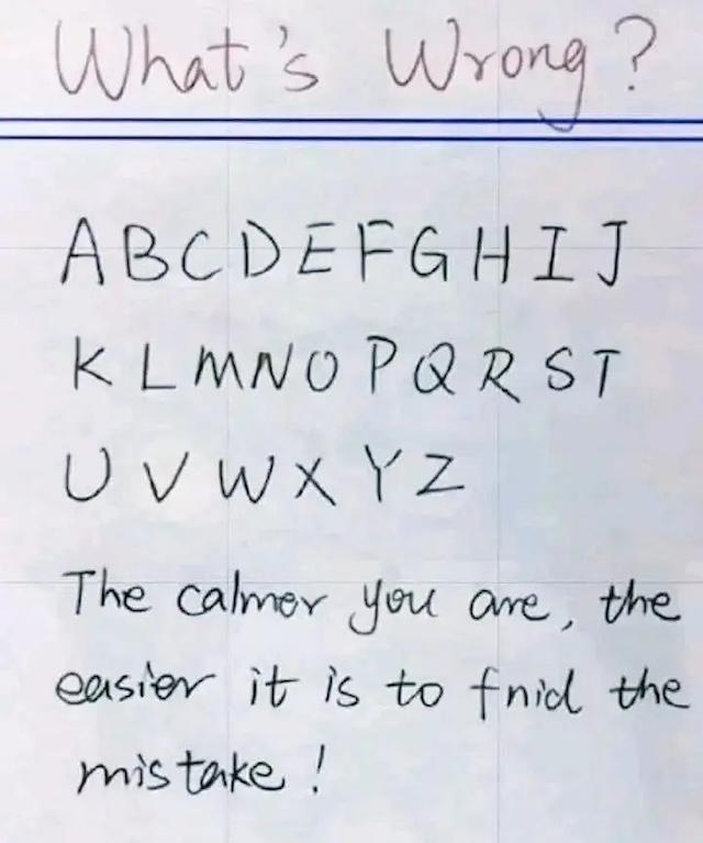 Think you have sharp observation skills? This visual puzzle is the perfect test! At first glance, the image appears ordinary—just an alphabet followed by an encouraging sentence. But lurking within is a small, sneaky mistake that most people miss on their first attempt. The challenge? Find it in under 5 seconds! Common patterns and auto-correction in your brain might trick you, but don’t give up. Ready to try? Take a close look, and see if you can beat the odds. Comment below with your answer and challenge your friends!