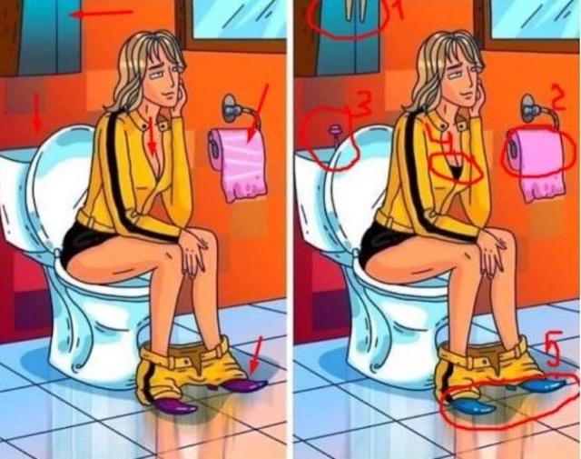 Think you’ve got eagle-eyed vision? Here’s a test: two nearly identical cartoons of a woman sitting on a toilet, and only five minute differences lie between them. Ready to prove your observational prowess? Set a timer for 15 seconds, lean in close, and see if you can catch every change!