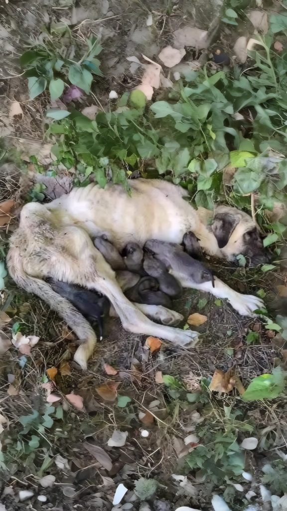 When rescuers first laid eyes on her, it was hard to believe she was still standing. Eda, a young mother dog, was dangerously thin, her body drained of strength after days of hunger and exhaustion. She could barely raise her head, yet she refused to step away from her puppies. Every bit of energy she had left had already been given to them. Even as her own body failed, she continued to nurse her babies, offering the very last drops of milk she could produce before her legs finally gave way beneath her.