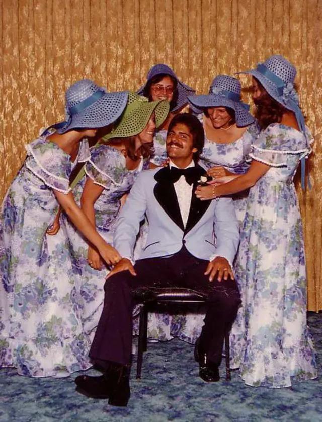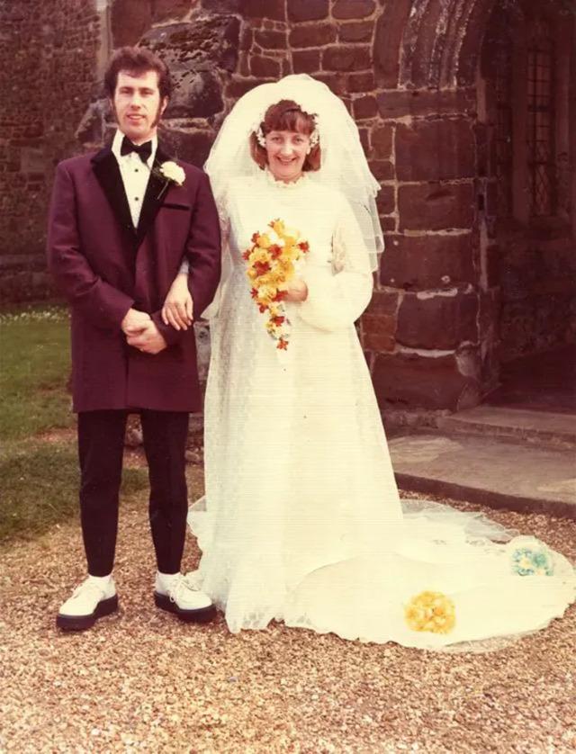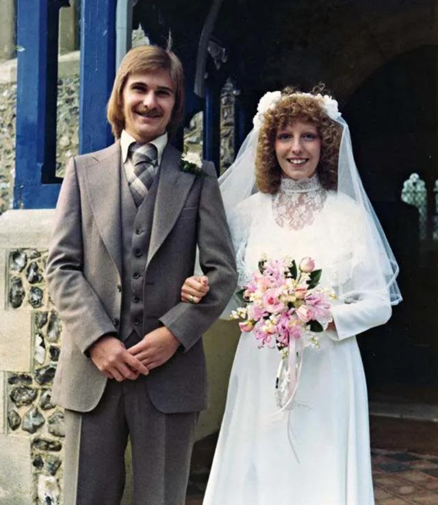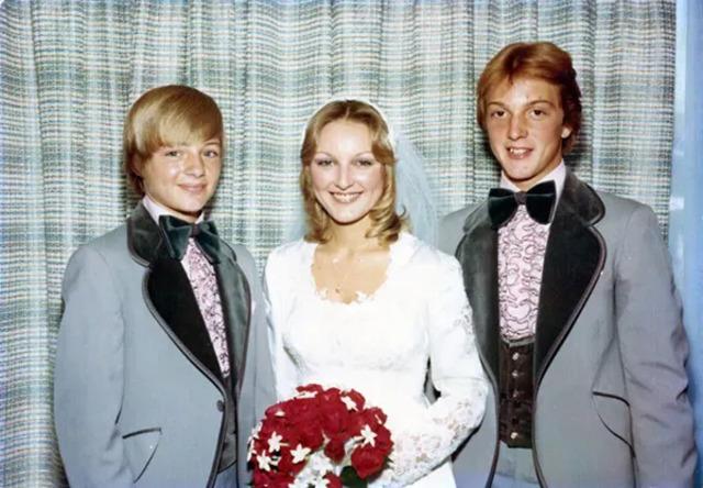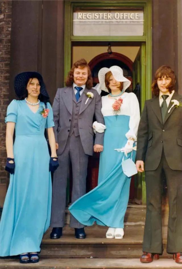 Grooms also broke away from tradition. While the classic black tuxedo was still a go-to for many, the 1970s saw an influx of colorful tuxedos. Powder blue, burgundy, and pastel hues appeared at the altar, reflecting the era’s wider fashion revolution. The choice of colorful suits wasn’t just a reflection of the changing fashion of the time—it was a statement of freedom and individuality. Grooms, just like their brides, were embracing color and personality, making wedding fashion an expression of the times.