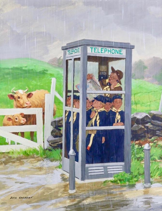 In another playful piece, a group of boys squeezes into a small phone booth to escape the rain. The sight of them huddled together, with a cow curiously peeking in from the outside, perfectly encapsulates the quirky, carefree nature of childhood. Sargent’s art often captured the humor in these simple yet unexpected moments, making them universally relatable.