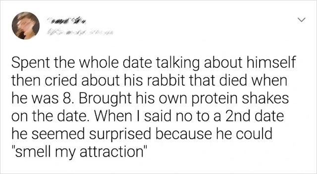 It’s one thing to talk about yourself on a date, but it’s quite another to do it for the entire evening. One man spent the entire date talking about his childhood pet rabbit that had died when he was eight. He even brought his own protein shakes to the date. When she turned him down for a second date, he seemed genuinely surprised, stating that he could “smell her attraction.” It was an eye-opening moment for her—sometimes, self-centeredness and a lack of awareness can make a date feel like an uncomfortable therapy session.