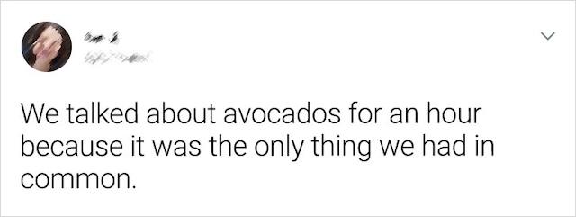 Sometimes, the only thing two people have in common is something as simple as a shared love for avocados. On one date, the conversation stretched on for an hour, revolving solely around this one topic. While it might sound absurd, it was actually the only thing they could both talk about. It might not have been the most exciting conversation, but it showed how sometimes, a shared, even trivial, interest can keep a date going. Not every conversation needs to be deep or profound to create a connection.