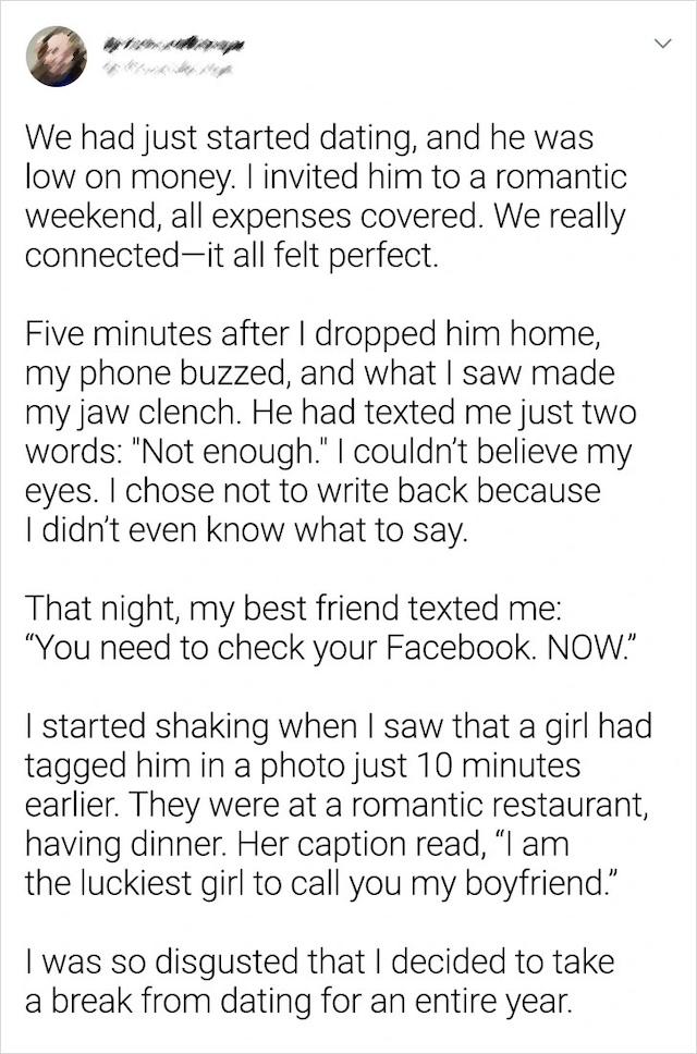 Sometimes, everything seems to be going perfectly until one unexpected twist completely changes the course of the night. That’s exactly what happened during a romantic weekend getaway. Everything had been planned out: a relaxing, romantic weekend where he wouldn’t have to worry about paying for anything. But just moments after dropping him off, she received a shocking two-word text: “Not enough.” Stunned, she didn’t respond. The real shock came when, a few hours later, her best friend messaged her to check Facebook. There, she saw a photo of him having dinner at a romantic restaurant with another girl, captioned, “I am the luckiest girl to call you my boyfriend.” Heartbroken and betrayed, she decided to take a break from dating for an entire year. It was a painful reminder of how quickly things can change, especially when trust is broken.