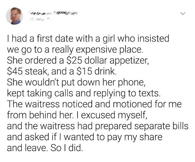 Sometimes, the difference in expectations between two people can be glaringly obvious on a date. On one particular evening, a woman insisted on going to a fancy, expensive restaurant. She ordered a $25 appetizer, a $45 steak, and a $15 drink, while he tried to keep the evening enjoyable. Unfortunately, she was more interested in her phone than in the conversation. She continuously took calls and texted throughout the meal, leaving him feeling completely ignored. Toward the end of the night, the waitress noticed the situation and discreetly motioned to him, suggesting they might want to split the bill. Without hesitation, he agreed, paying for his own share and leaving. It was a strange moment, but it revealed a valuable lesson: sometimes, no matter how much you spend, attention and respect are what matter most.