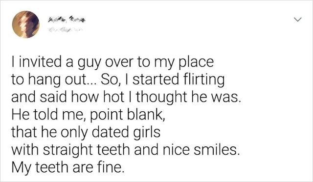 On one date, a woman invited a man over and began flirting, telling him how attractive she found him. But his response was a direct blow to her self-esteem. He bluntly stated that he only dated women with straight teeth and a “nice smile.” Although she had perfectly fine teeth, his comment made it clear that she wasn’t his type based on something superficial. The awkwardness of the situation lingered, and it marked the end of the date. While honesty is important, sometimes it’s better to keep harsh judgments to yourself. This experience highlights how superficial standards can play a huge role in dating, often leaving people feeling insecure over something trivial.