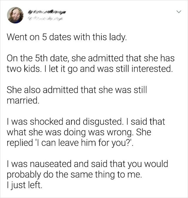 After five dates with a woman, things seemed to be going well—until she made a shocking confession: she was still married and had two kids. As if that weren’t enough, she casually asked him, “I can leave him for you?” This moment of honesty was nothing short of unsettling. The man couldn’t fathom the idea of being involved with someone who was already in a marriage. When he pointed out that what she was doing was wrong, she seemed nonchalant, suggesting that she would leave her husband without a second thought. Her lack of remorse was alarming, and he left, nauseated by the situation. It was a stark reminder of how some people are willing to deceive, regardless of the consequences.