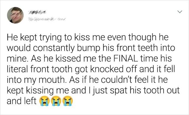 Romantic kisses are supposed to be sweet and memorable, but sometimes, they can end up being a disaster. One man repeatedly tried to kiss his date, but his front teeth kept bumping awkwardly into hers. The final straw came when his front tooth literally fell out during the kiss and landed in her mouth. Shocked and disgusted, she quickly spat it out and left. While this moment was certainly unforgettable, it also served as a humorous reminder that not every romantic gesture goes as planned.