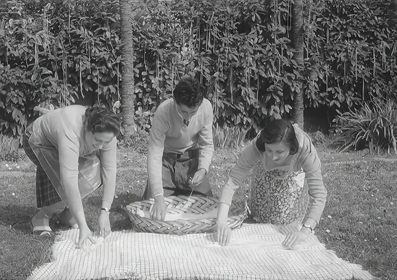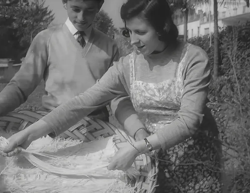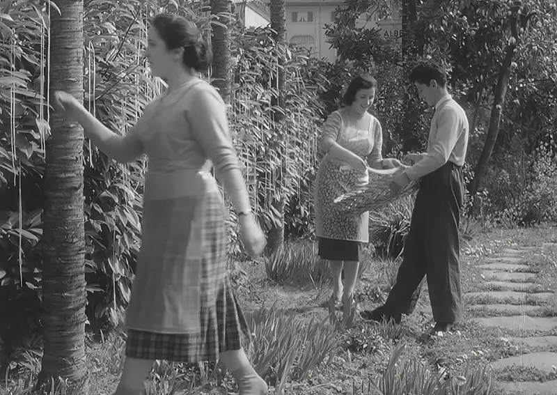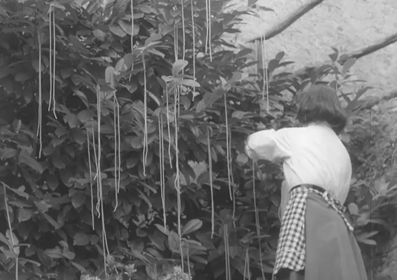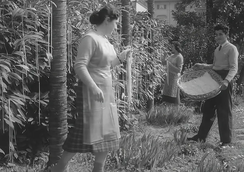 To ensure the raw spaghetti didn’t dry out before filming, de Jaeger stored it between damp cloths, carefully preserving its appearance. The next step was to recruit local Swiss women, dressed in traditional Swiss national attire, to act as harvesters. These women were filmed delicately plucking the pasta from the trees, filling baskets, and laying the spaghetti out to dry in the warm Alpine sun.