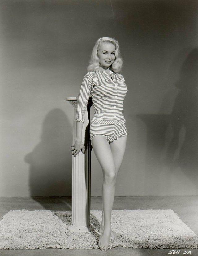 It would be impossible to talk about Joi Lansing without acknowledging her signature look—one that was synonymous with 1950s Hollywood glamour. With her platinum blonde hair, perfect smile, and impeccable fashion sense, Lansing epitomized the classic “blonde bombshell” image that was so popular at the time.