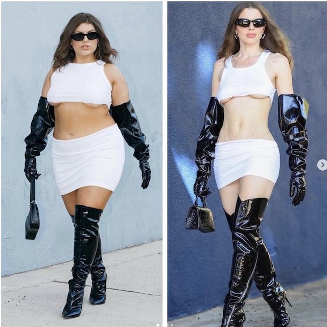 Gabriella Athena Halikas, a model and influencer, embraces her curves with confidence and style. One of her standout recreations is Bella Hadid’s look, where she nails the supermodel’s cool-girl vibe. From the chic black leather jacket to the sleek hair and minimal makeup, Gabriella proves that timeless fashion is for everyone, regardless of size.