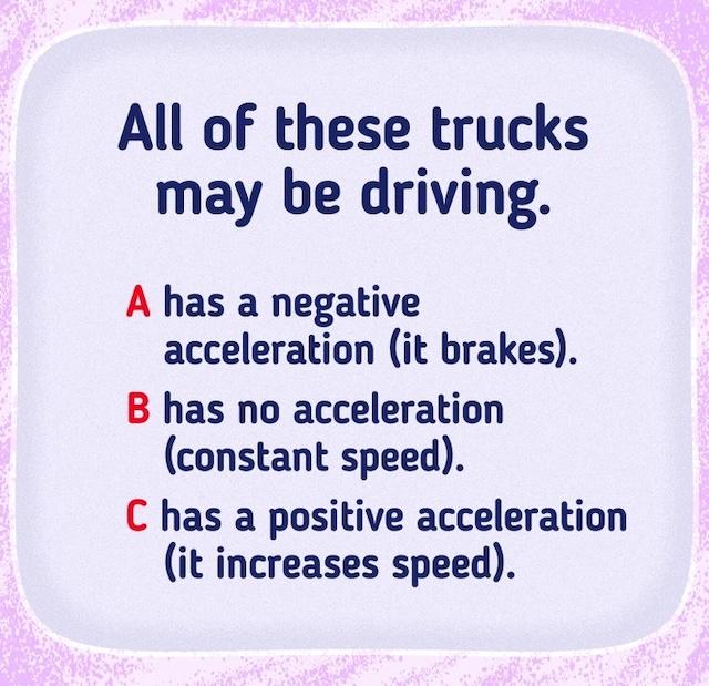 By applying the basic physics concept of acceleration, you realize that all three vehicles are moving simultaneously, just in different ways: