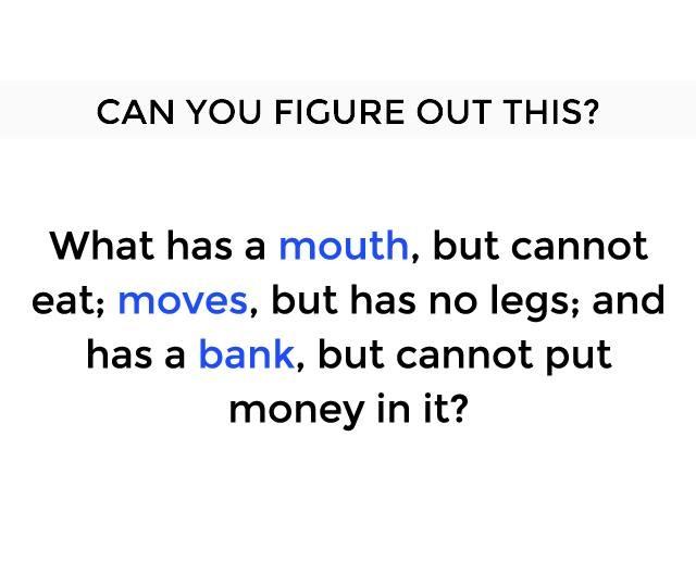 “What has a mouth, but cannot eat; moves, but has no legs; and has a bank, but cannot put money in it?”